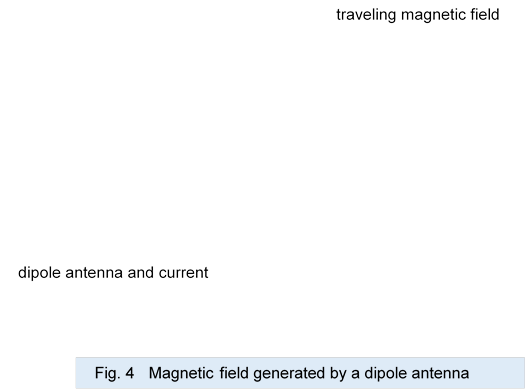 Figures 2 through 4 show schematically how the current supplied to the dipole antenna generates a magnetic field around the antenna while it damps and vanishes in the antenna. Note that the behavior of the electrons is indicated by the simulated circle described in "Form of current".