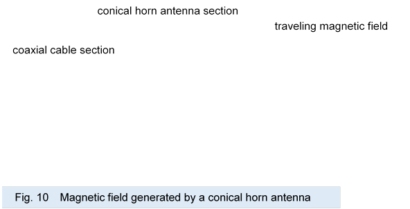 As described above, in a conical horn antenna, the magnetic field generated by the supplied current floats in space and pushed out from the aperture and travels away by the reversed polarity magnetic field generated by the subsequent current.