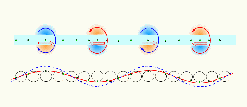 図1は、進行波型の交流電流が流れる導線の中で振動する電子の様子を 模擬的に示したものである。