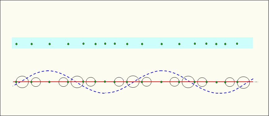 図3に、上記図1と同じように、電子の振動の大きさを示す振動模擬円を用いて、定在波を形成する交流電流が流れる導線(導体)の中の電子の様子を模擬的に示す。